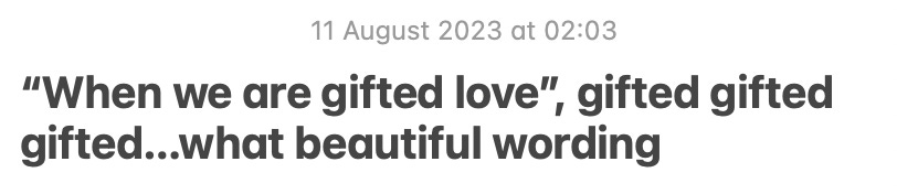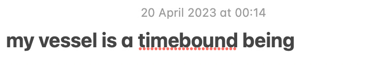 Sometimes I wake up and find notes I do not remember writing, yes my vessel is a timebound being, and yes this means absolutely nothing. Perhaps nighttime me is even more pretentious than daytime me - who would’ve thought? Not me!