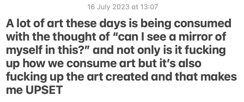 Also - and this is not to do with the issue of how things are mirrored, but more so when people consume art with ‘bad people’, and as a result it makes them not like the art itself because the people are assholes and the consumer doesn’t see themself like that… I personally quite liked it when I could consume things without thinking about what part of me to project parts of characters onto, and just naturally find bits of me within it instead. The simple truth is that we are not polished people by nature. Listening to songs about women being feral and messy and keying pretty little souped-up four-wheel drives, or watching a deeply flawed Carrie Bradshaw cheat, lie, hurt, and be a terrible friend at times, or reading about tired and disgruntled women who don’t want to be everything all the time and especially don’t care to be successful, change the world, or leave bed … were always so interesting for me, they tapped into a corner of my brain well-polished mirrors simply do not right now. We don’t want to see our ‘ugly’ sides, we do not want to feel guilt or hurt or shame, we want perfection, a mirror of only the cleanest versions of ourselves, a reverse Dorian Grey.